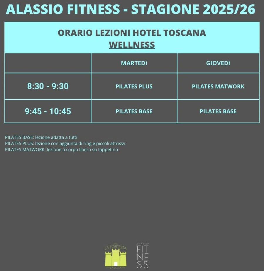 L’Hotel Toscana ( https://www.hoteltoscanaalassio.it ) ospiterà i corsi di Pilates, stretching e risveglio muscolare, e permetterà di essere coccolati da una SPA di ottimo livello, dai vari servizi di una struttura a quattro stelle, tra cui il ristorante “La vecchia maremma” con una cucina specifica per piatti gluten free.