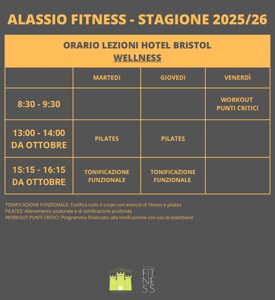 L’Hotel Bristol ( https://www.hotelbristolalassio.it ) accoglierà in una sala, appositamente dedicata, corsi di tonificazione funzionale finalizzati al miglioramento del tono muscolare, dell’equilibrio e della postura. Un’attrezzata zona relax con piccola sala pesi e bagno turco servita da spogliatoi con docce e asciugacapelli è a disposizione di clienti e atleti previa prenotazione. L’hotel dispone di un accogliente bar per una pausa rinfrancante e, ovviamente di un ristorante con cucina curata e genuina, improntata alle specialità del territorio.